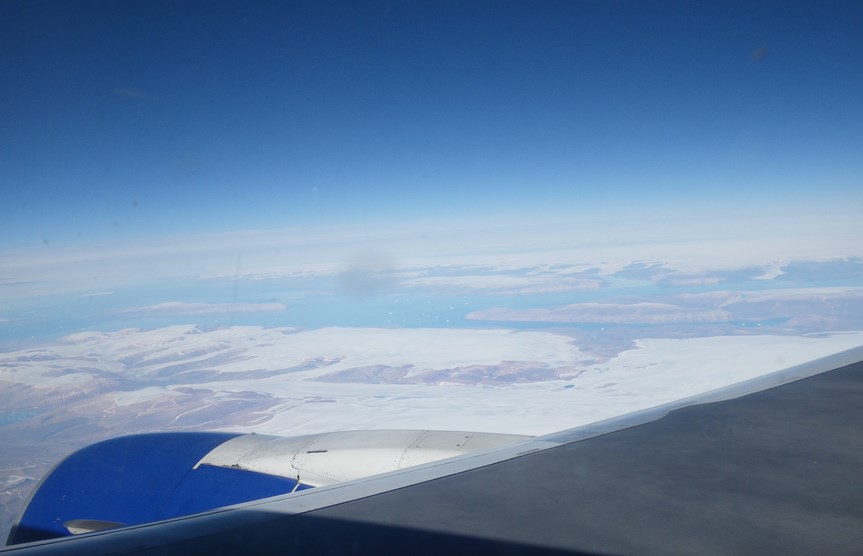 Départ de Fontafie à 18h30. Nous arrivons à Paris et nous attendons à l'aéroport. Début des galères à l'enregistrement. Il faut une autorisation d'entrée sur les USA pour embarquer. Nous faisons la démarche par internet très rapidement (ESTAT). Nous subissons une grosse fouille à la douane Francfort. Puis nous survolons le Groënland (sur cette photo) avec une vue dégagée ainsi que l'île d'Ellesmère. Nous arrivons à Anchorage avec un sérieux interrogatoire à la douane. On court car l'avion avait du retard mais on loupe l'embarquement du dernier vol. Heureusement il reste des places dans le suivant qui par chance s'arrête à Cordova, Yakutat, puis Juneau (20h00). Alors, nous prenons la voiture louée depuis la France. Enfin, nous dormons au pied du glacier Mendenhall. Le lendemain, nous faisons des courses, nous visitons la vieille ville et nous allons au port où nous dormons.