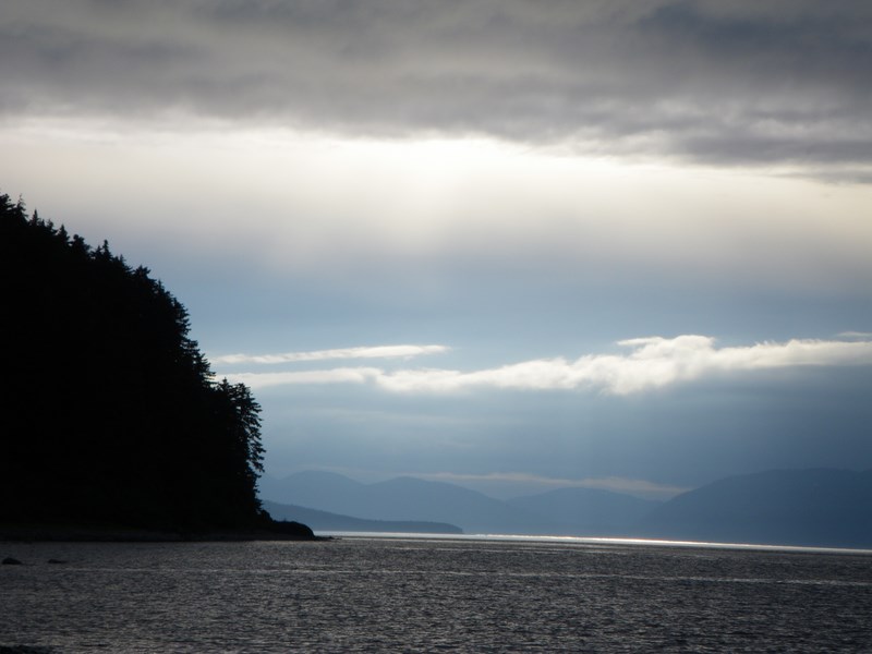 Nous nous levons de bonne heure pour profiter de la marée favorable. Après 7 heures à pagayer, nous sommes enfin au Point Adolphus. Il y a des dizaines de baleines. Nous les observons faire des dizaines bonds pendant uns heure. Très impressionnant. Elles retombent dans l'eau avec un bruit fracassant. De nombreux bateaux chargés de touristes tournent dans la zone. Nous montons le camp et allumons un feu. Puis les touristes s'en vont. Enfin les baleines que pour nous! Nous les rejoignons en kayak mais les lions de mer nous attaquent. Avec beaucoup de vigilance, nous pagayons parmi nos baleines pendant 30 minutes. Nous observons de nouveaux sauts (breaching) et elles frappent très souvent l'eau violemment avec leur queue (lobtailing). Nous rentrons car les lions de mer nous persécutent.