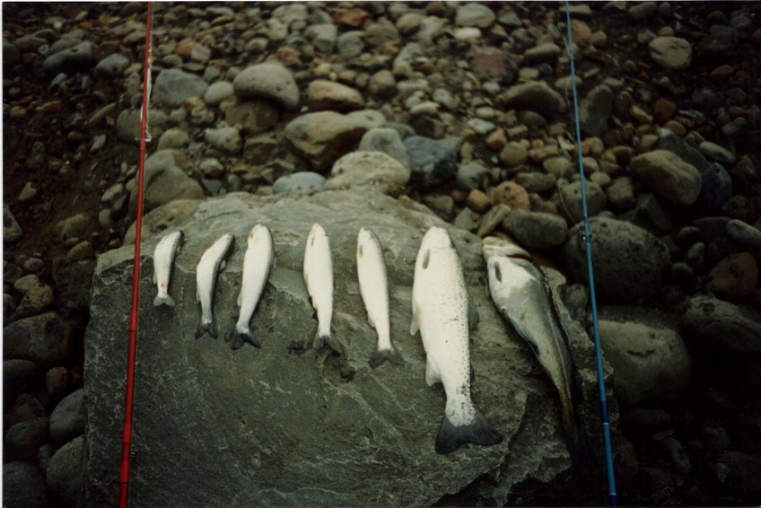Une pêche en mer dans le fjord d'Akureiri. De droite à gauche, une morue, une magnifique truite de mer prise par Kinou, et des jeunes saumons. La pêche est vraiment miraculeuse. Les morues sont à volonté. Nous n'en garderons qu'une.