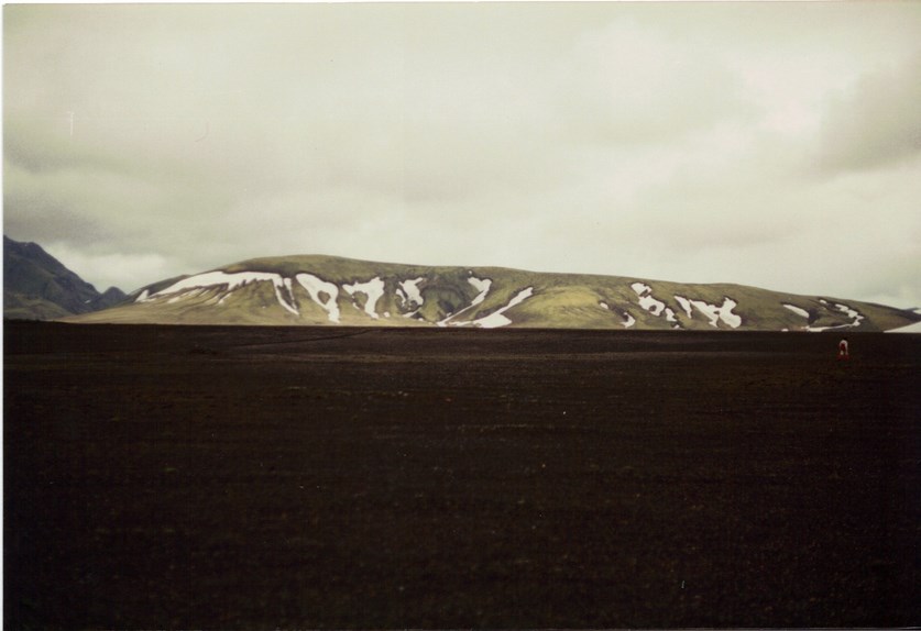 Nous continuons notre randonnée avec les sacs à dos. Nous sommes en totale autonomie. Nous approchons de Landmannalaugar dont on distingue une montagne typique. Les franchissements des gués nous posent trop de problèmes. Ils sont trop nombreux et nous sommes au début du mois de juillet, alors la fonte des neiges est encore importante. Il y a beaucoup d'eau (très froide), de courant et les sacs sont lourds. Nous décidons de retourner sur nos pas jusqu'à Burfell et de reprendre un car pour Selfoss. De là, nous reprendrons notre périple autour de l'île.