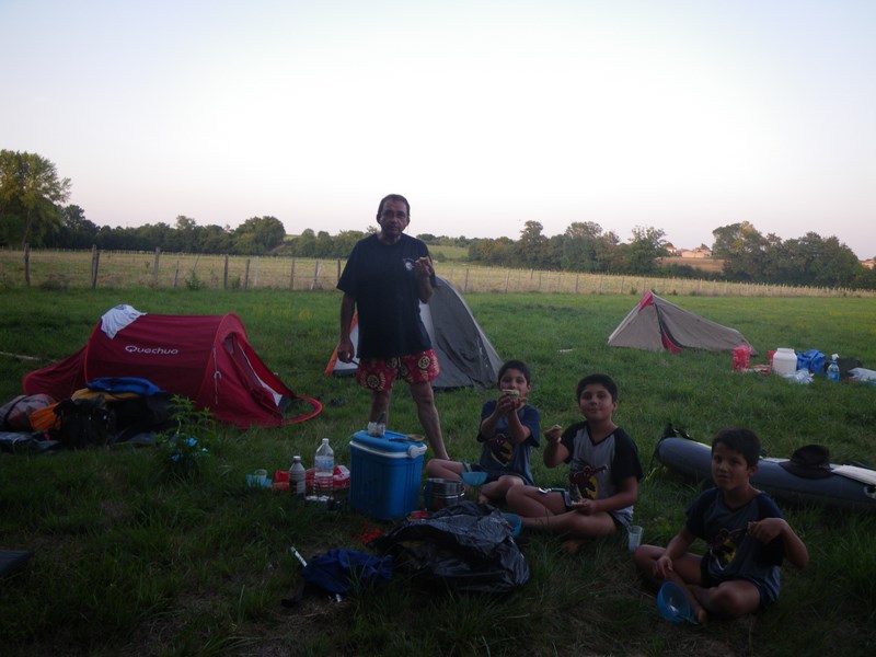 Au milieu des vaches, nous montons le camp. Nous dégustons les "pâtés de Giselle" dès notre premier repas.
