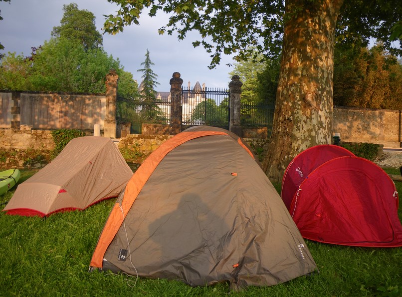 Nous arrivons à Saint-Savinien à contre courant (marée montante sur l'océan) et sous une averse. Nous avons froid. On change les vêtements humides et on mange. Nous montons notre premier camp devant un château au bord du port. La nuit sera très fraîche (autour de 0°C). Dans leur sac de couchage, les garçons dorment avec leur blouson.