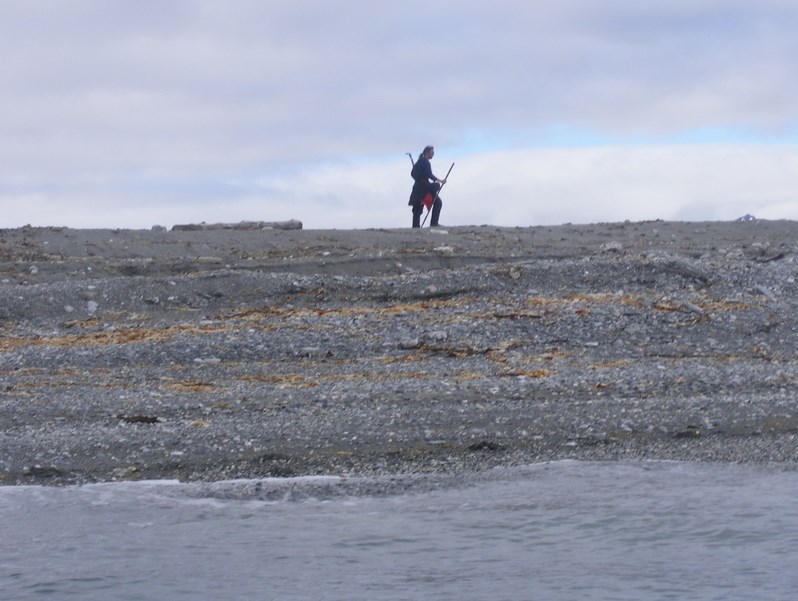 Jean-Philippe, concentré, scrute la plaine et le rivage. Il assure la sécurité de ses trois compagnons.