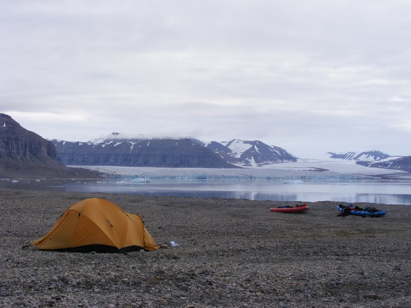 Durant cette garde, un énorme paquebot passe de l'autre côté du fjord, à deux kilomètres. Il s'approche du glacier, très près d'ailleurs. A la jumelle, j'observe les touristes qui sortis sur les ponts photographient le glacier, plus aussi grand face à 300 passagers. Après 20 à 30 minutes, l'énorme bateau repart...... jusqu'au prochain glacier. Certains remarquent sur l'autre rive notre camp. Durant leur voyage, ils verront beaucoup de beaux paysages grâce aux longues distances parcourues, comme promis dans la brochure qu'ils ont précédemment lue. Peut-être apercevront-ils des ours? Sinon, ils iront probablement au zoo.
