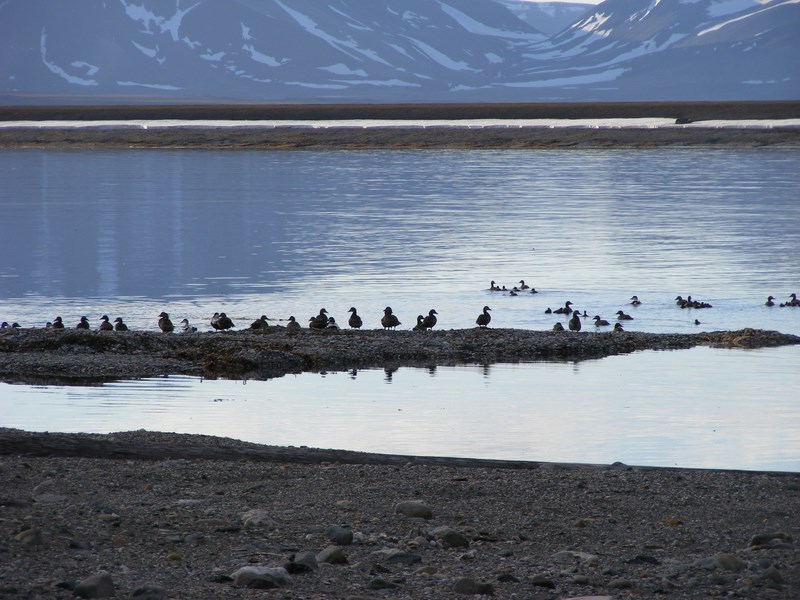 Kinou dort, Jean-Philippe et Laurent sont partis randonner dans le Bellsund. Je monte la garde. Le vent se calme, et je vais en profiter pour faire un brin de toilette et une lessive. J'observe les nombreux oiseaux qui comme lors des campements nous portent compagnie. Soudain, j'aperçois un renard polaire, il se cache, approche un groupe de canards. Puis il se décide à lancer l'assaut. Échec! Les canards se mettent à l'eau et le narguent à 2 mètres. Il les regarde impuissant, l'eau est trop froide.